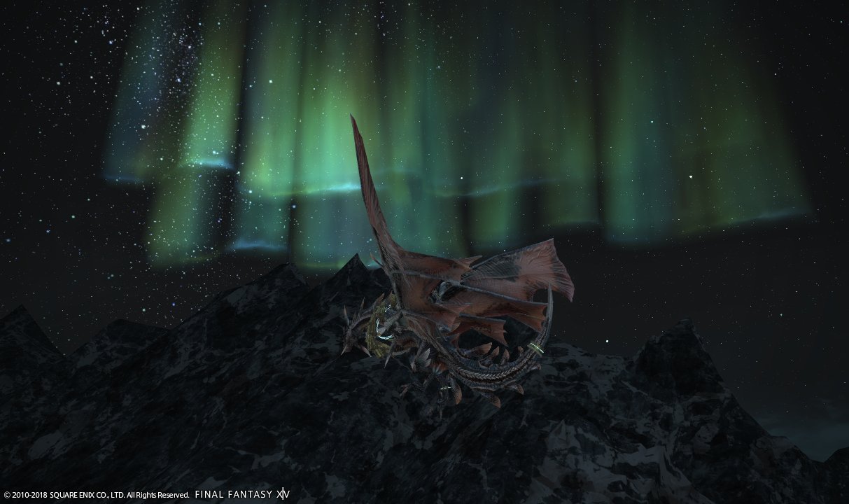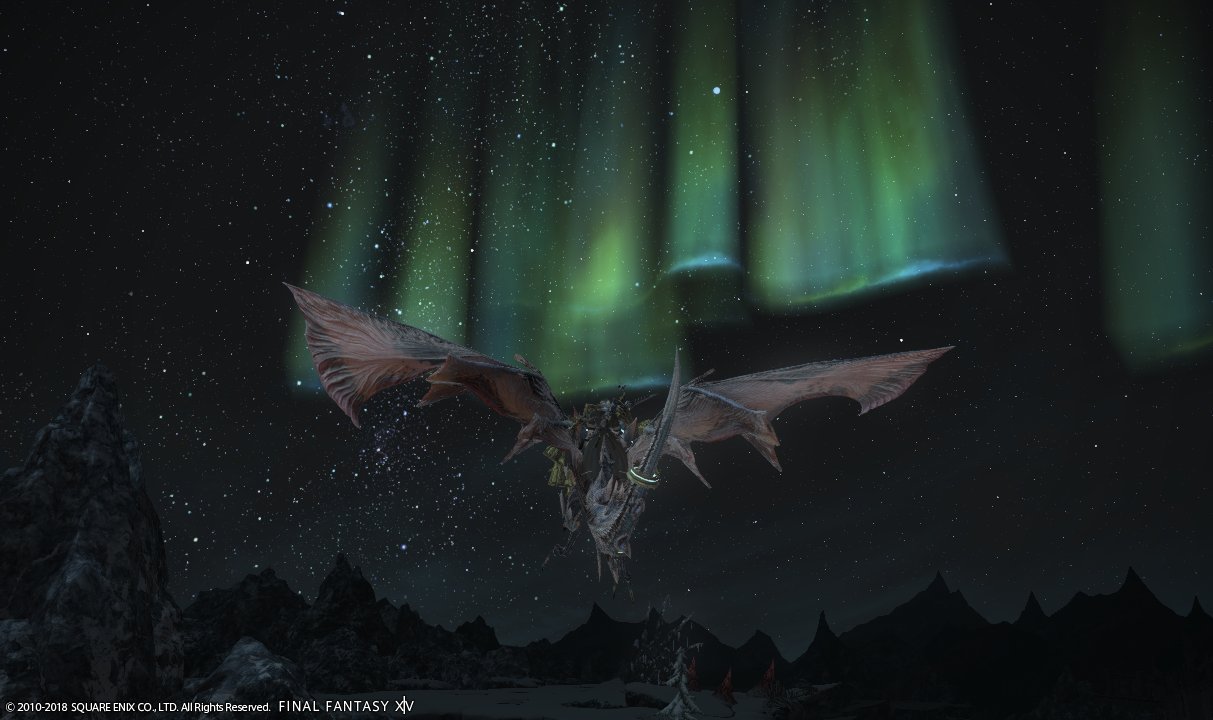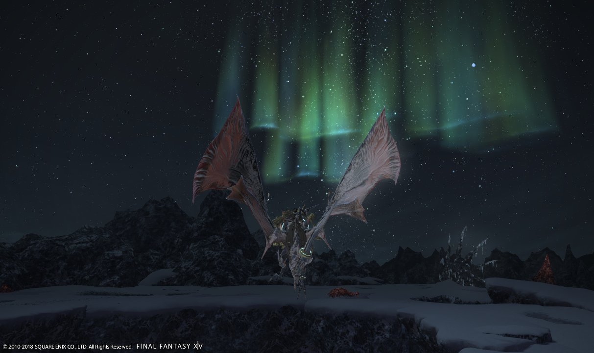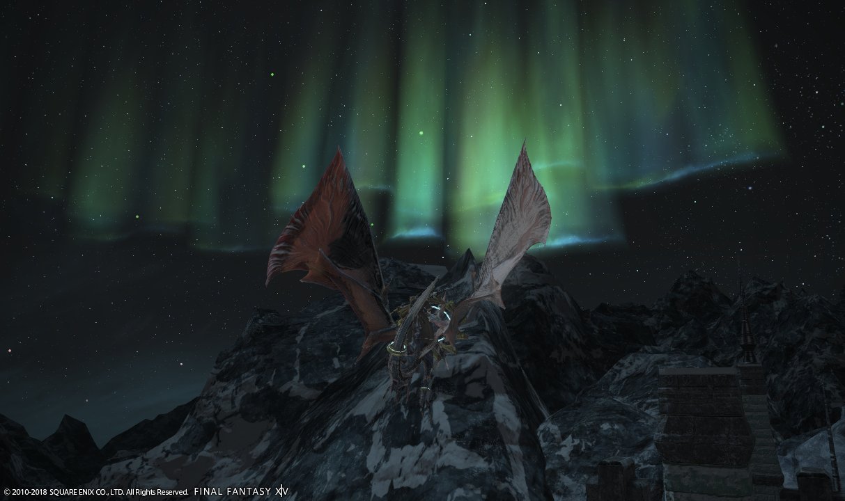 マウント呼び出して空へと舞い上がったら、快晴の夜空にオーロラが!